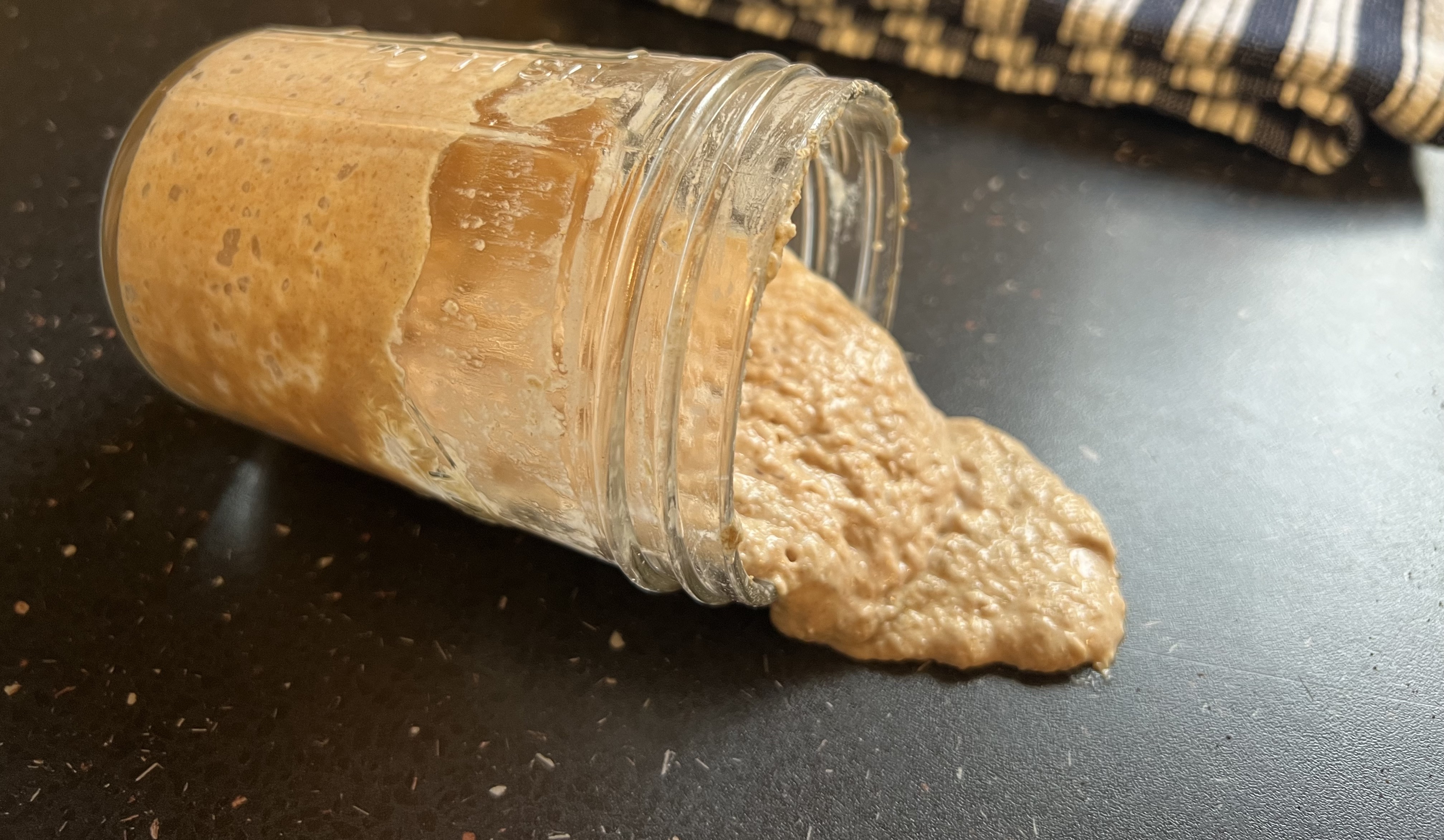 Now, remember our ratio: 1:1:1. If you just whack in another 150g of water and 150g of flour you will have nearly half a kilogram of starter and it's gonna rise...and it may overflow and go everywhere. Also, you don't need an entire pound of effing starter.