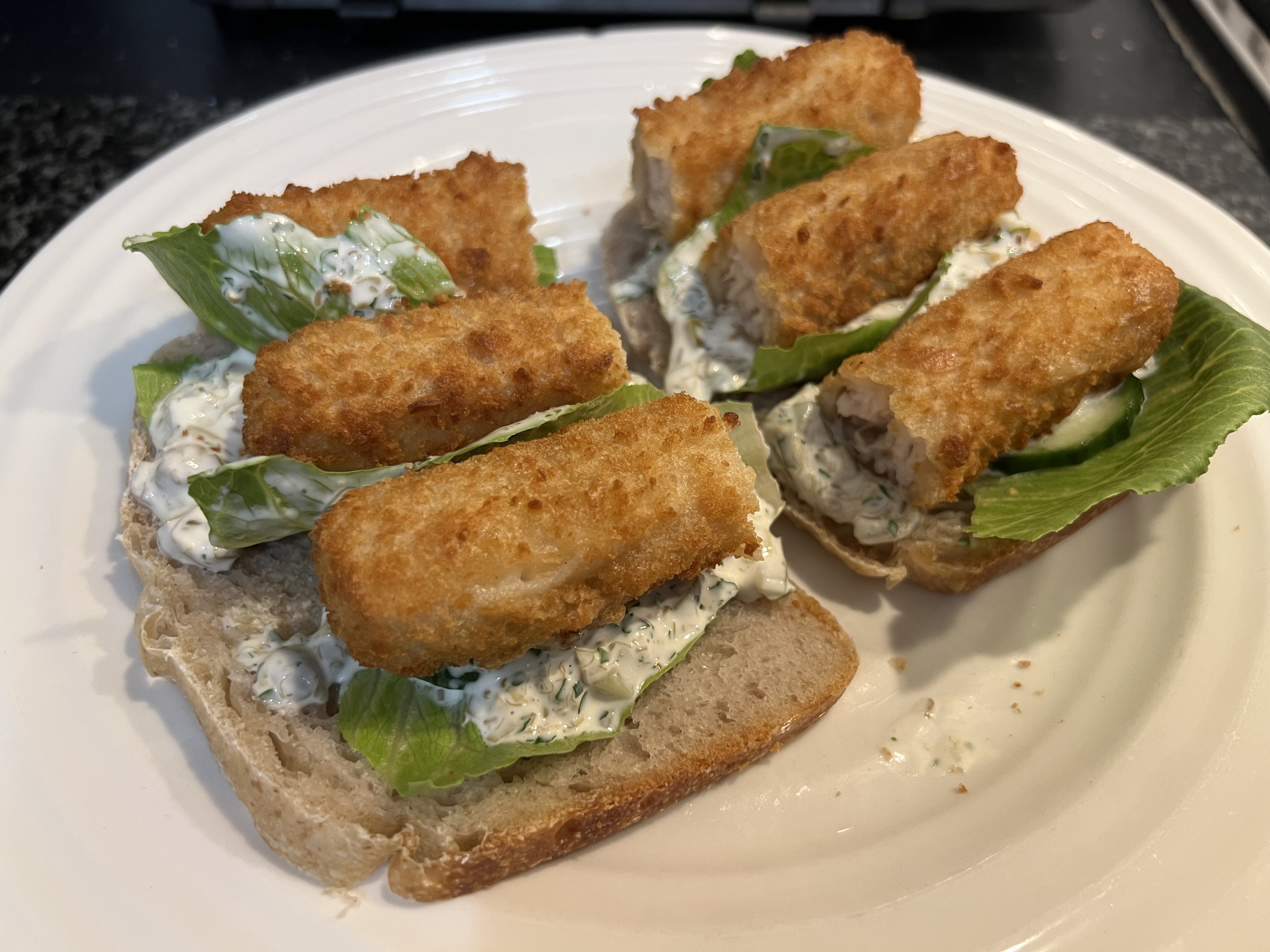 Breaded cod on a bed of lettuce and cucumber, served on freshly baked sourdough, with home made tartar sauce (mayonnaise with chopped gherkins, capers, parsley and tarragon with a splash of lemon juice). Or in No-Bullsh#t terms: a fish finger sarnie.